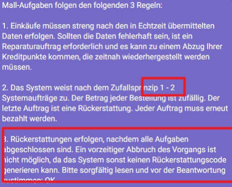 3. Rückerstattungen erfolgen, nachdem alle Aufgaben abgeschlossen sind. Ein vorzeitiger Abbruch des Vorgangs ist nicht möglich, da das System sonst keinen Rückerstattungscode generieren kann. Bitte sorgfältig lesen und vor der Beantwortung zustimmen: OK